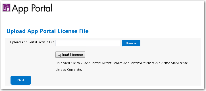 - When you launch the application for the first time, the Upload App Portal License File page opens.