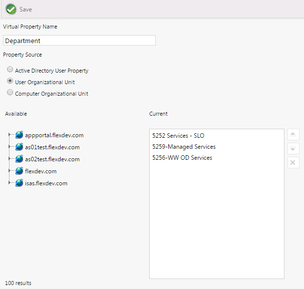 • User Organizational Unit —Select this option to extract values from a User Organizational Unit. When you select this option, a tree view of Organizational Units will be displayed in the Available area. Click and drag to move properties from the tree to the Current list.