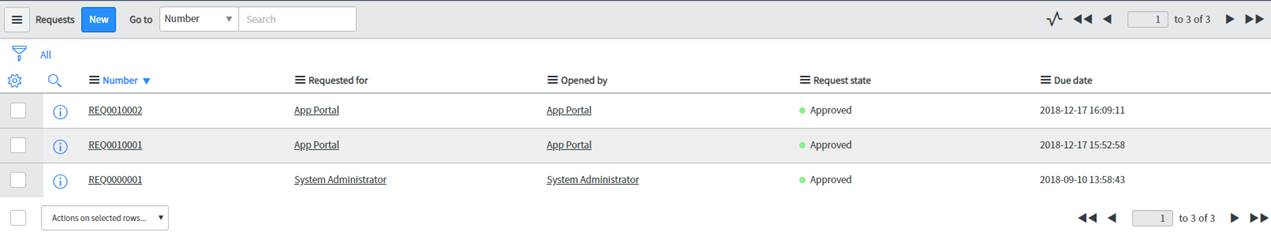 - This displays all the requests placed for App Portal catalog items via ServiceNow. Their status can be seen under the Request state . column.