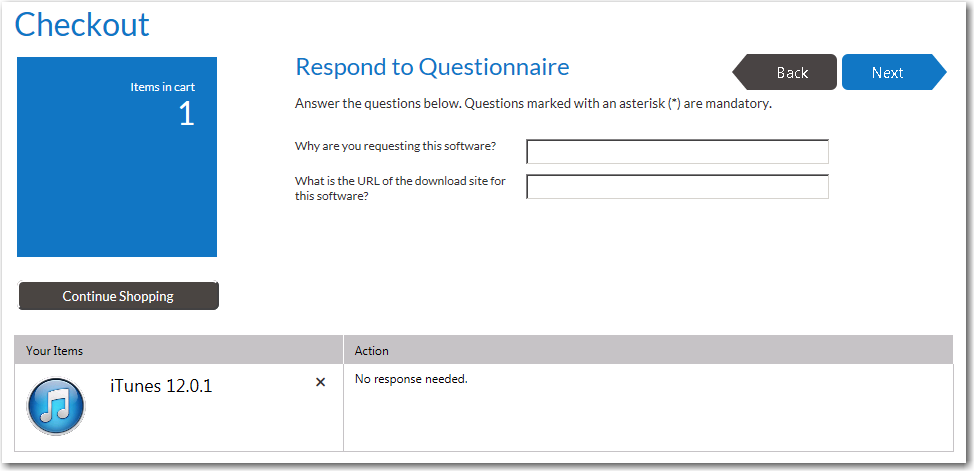• If the questions are associated with all of the catalog items in your cart, the questions will be listed at the top of the screen. If the questions pertain to a specific catalog item, the questions will be listed in the table below next to the catalog item.